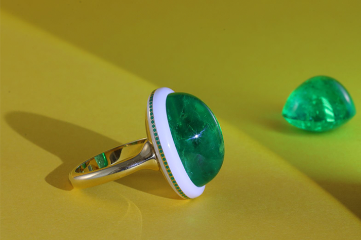 The emerald, once weighed down in an uninspired setting, has been gently lifted into new life. Reset in buttery yellow gold and framed in soft ivory enamel, it finds its voice again; contemporary, confident and full of promise.