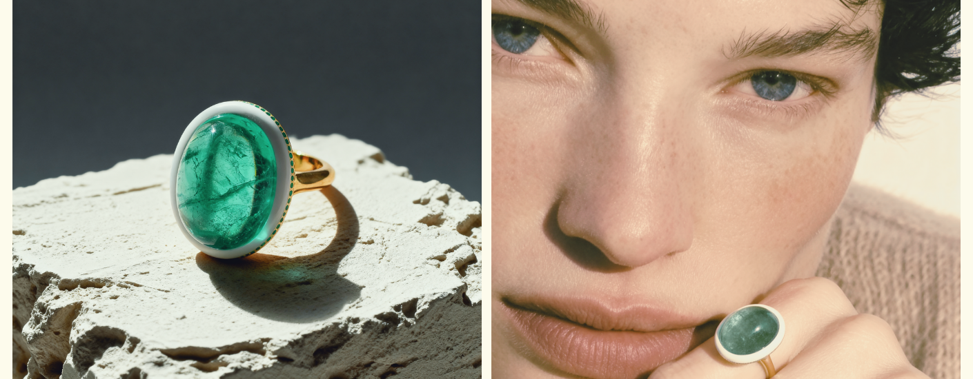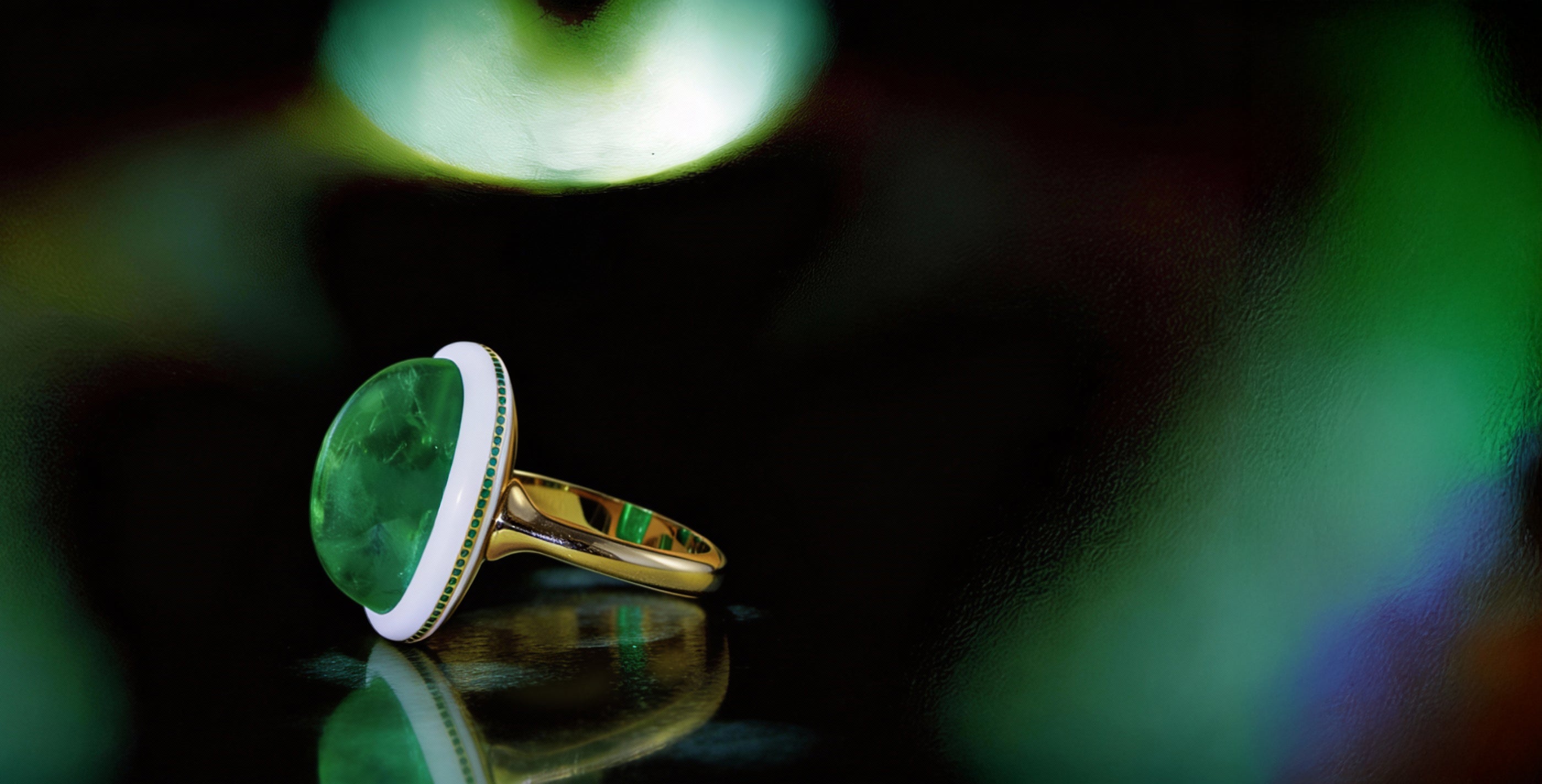 The emerald at the centre of this ring carries the stillness of a storm at rest: deep, saturated green with flecks of mystery. Made for those who lead quietly but powerfully.