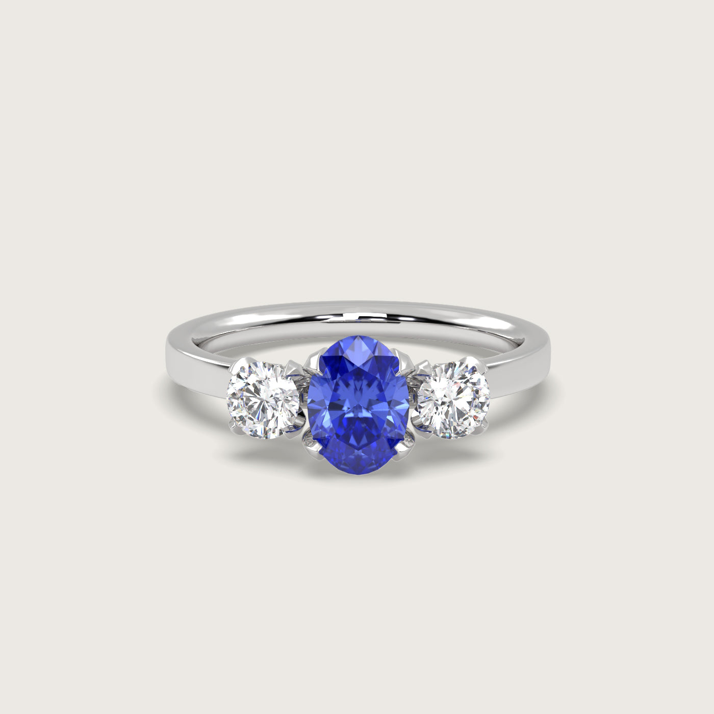 Three stones, one story, with a twist. This oval sapphire and diamond engagement ring features a natural, oval sapphire flanked by a pair of sparkling white diamonds, all in our signature Fleur de Luce claw setting. Symbolic, sculptural and beautifully balanced.